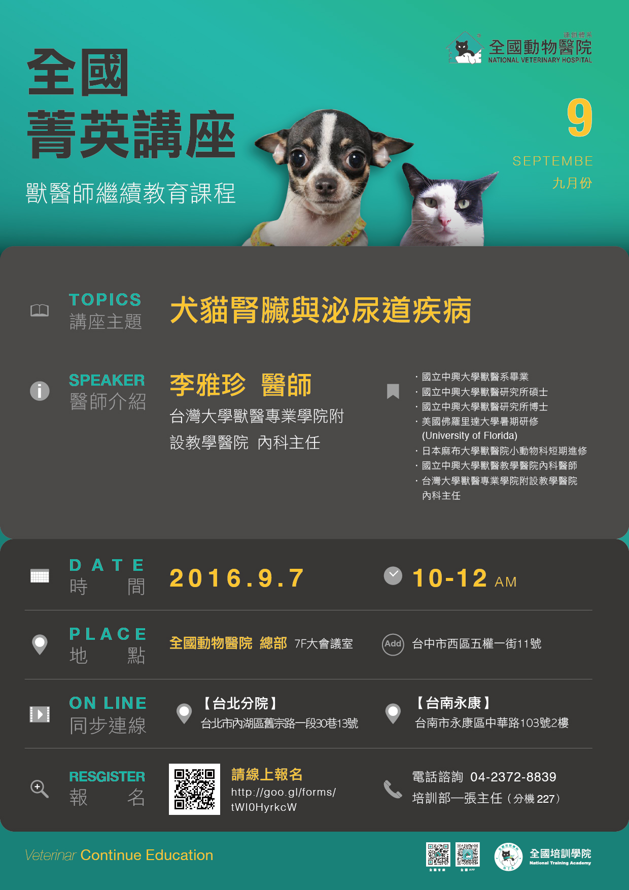 講師:台灣大學獸醫專業學院附設教學醫院 內科主任 李雅珍醫師 講題:犬貓腎臟與泌尿道疾病 日期時間:9/7 10:00~12:00 地點: 全國總部7F會議室 (台中市西區五權一街11號) **同步視訊分院: 台北分院(台北市內湖區舊宗路一段30巷13號) 台南永康分院(台南市永康區中華路103號2樓) 報名方式:線上或電話報名04-23728839分機227 培訓部張主任 報名網址: http://goo.gl/forms/tWI0HyrkcW